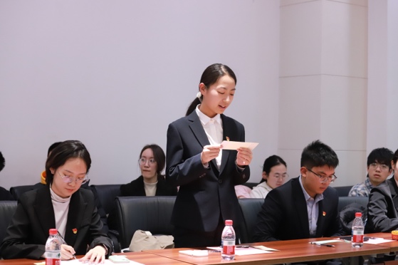 在学生代表发言环节,赵瑾、李雨欣两位同学结合党员身份、专业学习与学生工作经历,分享了学习全会精神的体会。他们表示,要将个人成长融入国家发展大局,持续加强理论武装,夯实专业基础,积极投身实践,努力成长为有理想、敢担当、能吃苦、肯奋斗的新时代金融人才。