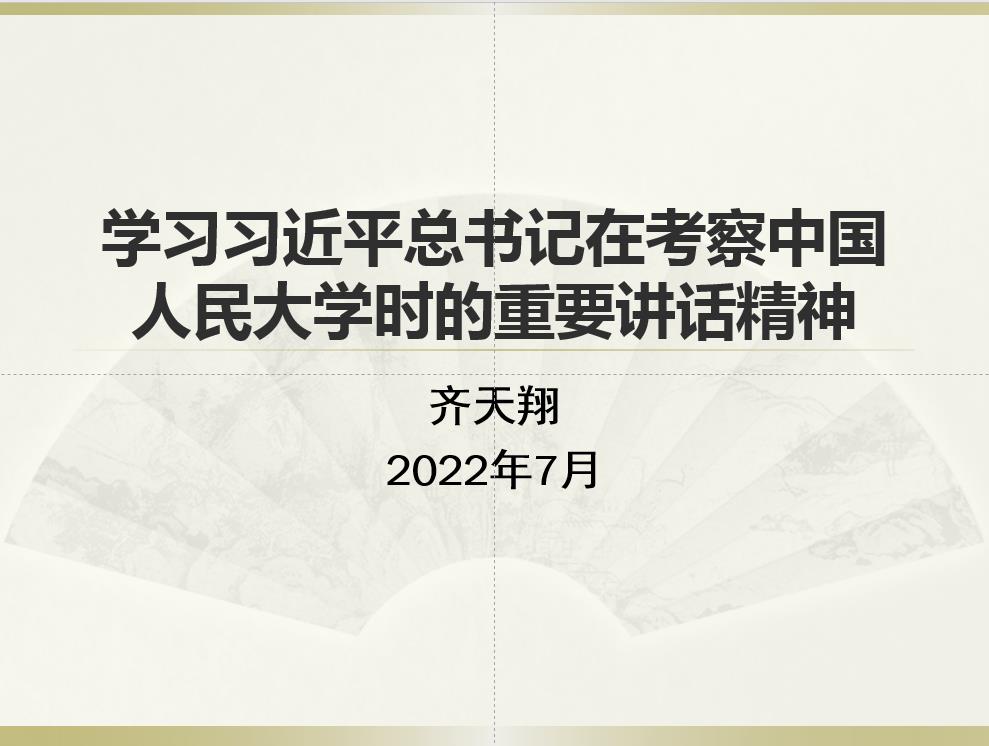 齐天翔首先介绍了习近平总书记考察中国人民大学的背景。党的十八大以来,每年五四青年节前夕,用考察、回信等方式寄语青年一代,已成为习近平的一个惯例。今年4月25日上午,在五四青年节来临之际,习近平总书记来到中国人民大学考察调研。习近平代表党中央,向全国各族青年致以节日的祝贺,向中国人民大学全体师生员工、向全国广大教育工作者和青年工作者致以诚挚的问候。