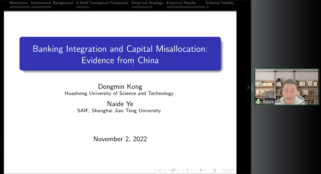 2022年11月2日,皇冠体育网址 金融皇冠体育网址在线举办2022年第4期经济金融名家讲坛,特邀华中科技大学二级教授、博士生导师,China Finance Review International、EMFT、IJFE等SSCI期刊副主编孔东民作题为“Banking Integration and Capital Misallocation: Evidence from China”讲座。本期论坛由皇冠体育网址 金融皇冠体育网址副院长王茂斌教授主持,院内外师生共计80余人参加。
